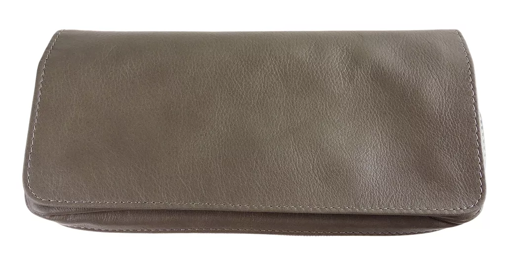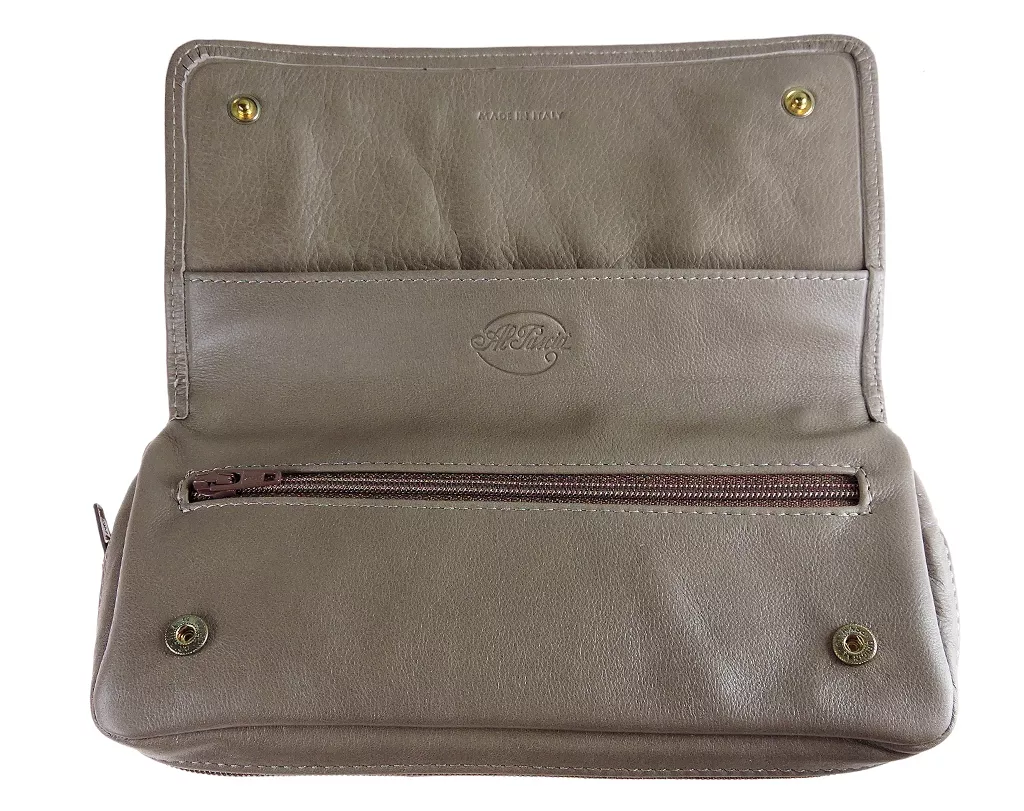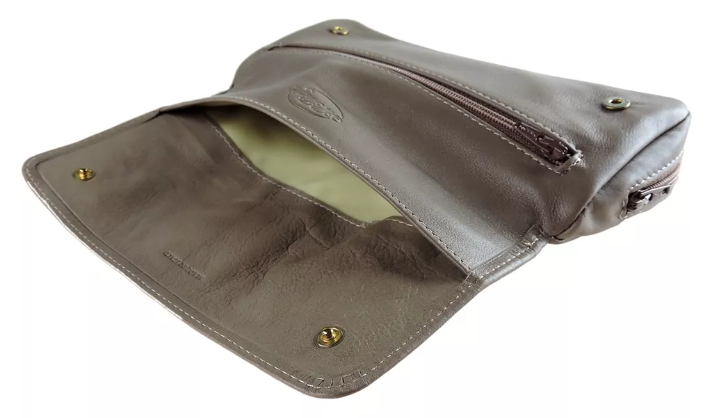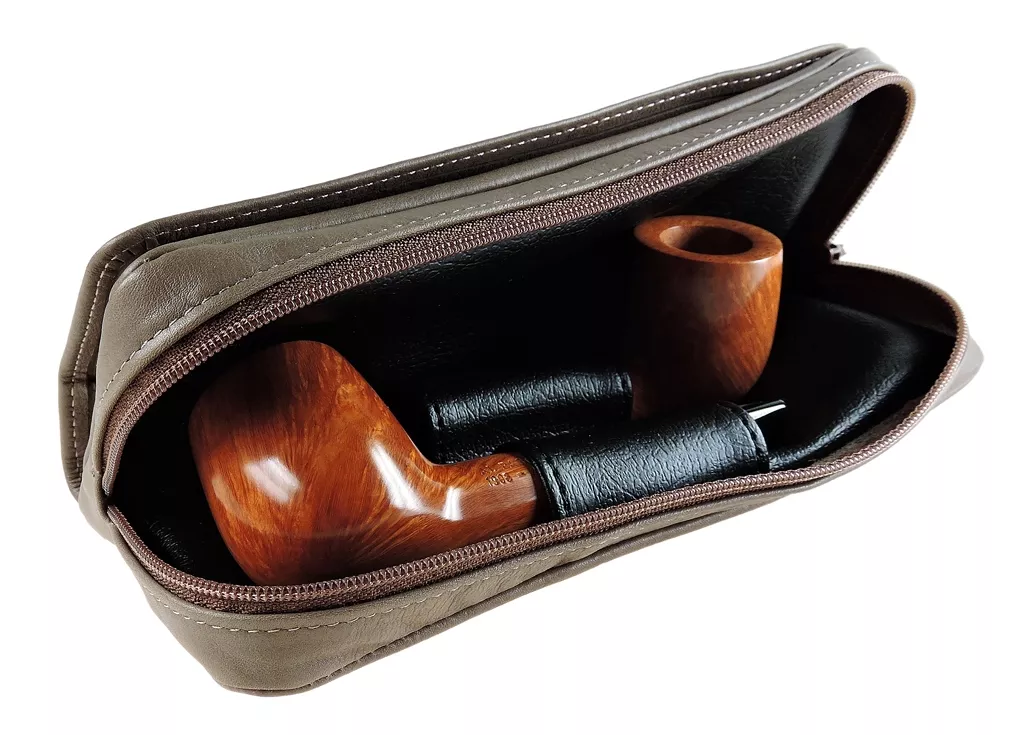 Made in Italy Material: fine leather Color: dark beige Snap closure One multi-use zippered inside pocket One zippered pocket for two pipes One inside pocket for tobacco with latex lining Pipes are not included