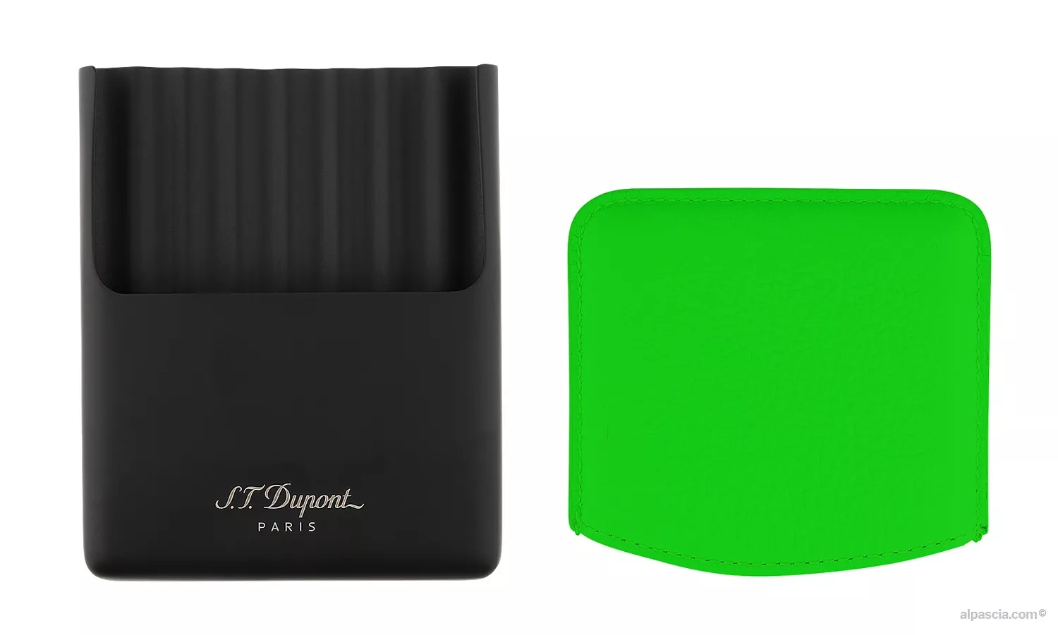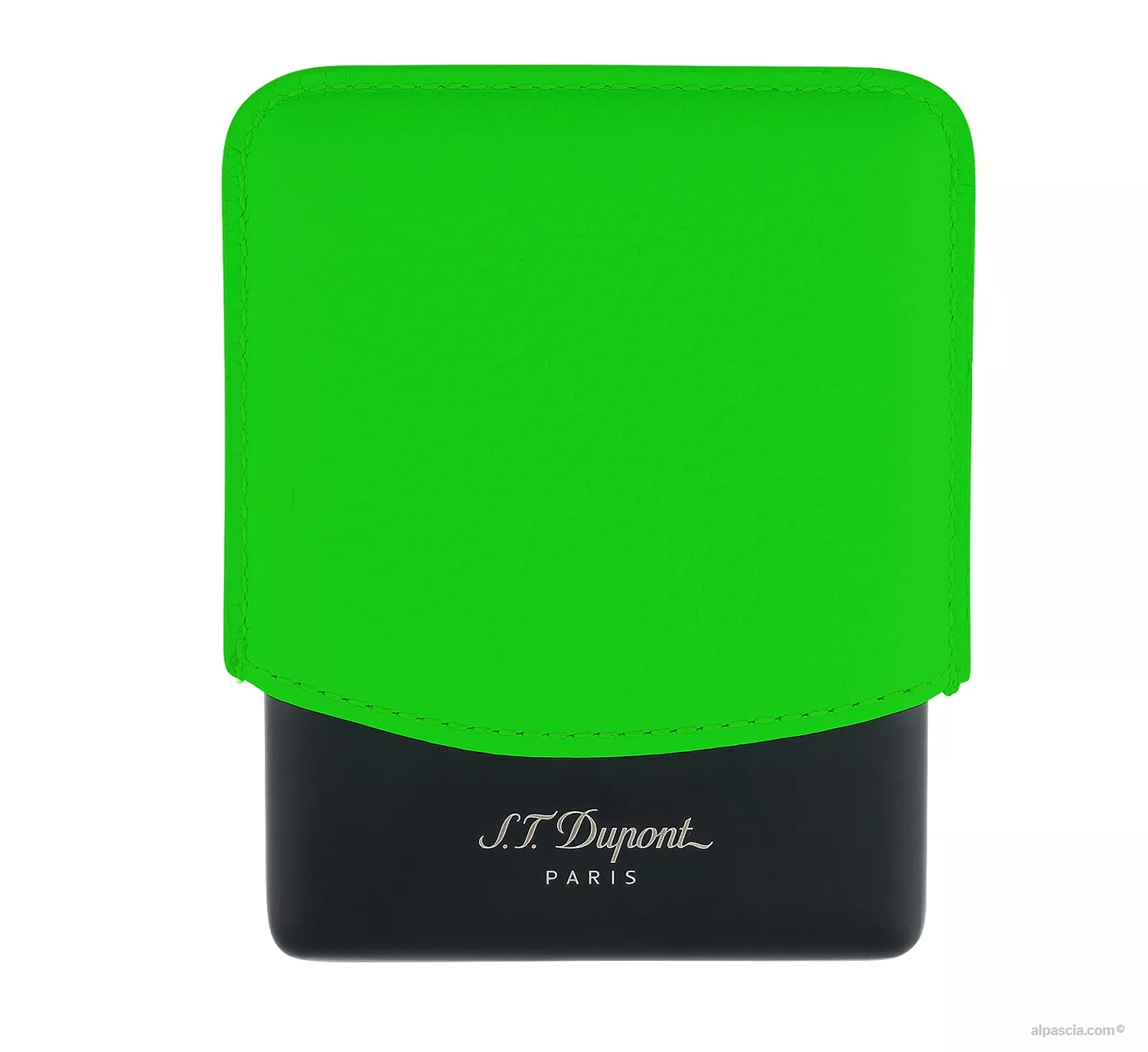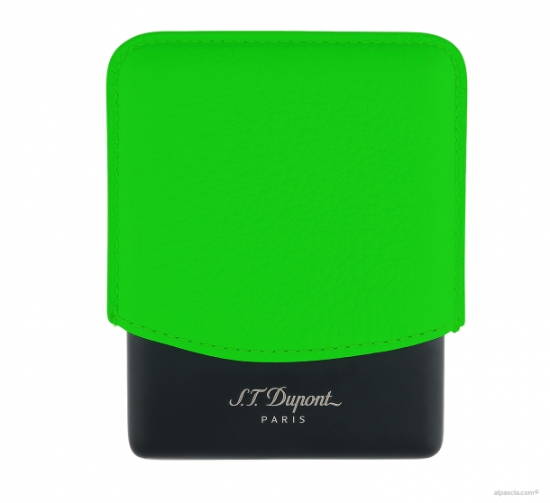 Cigarette case in fluo green grained calf leather and matte black metal base.