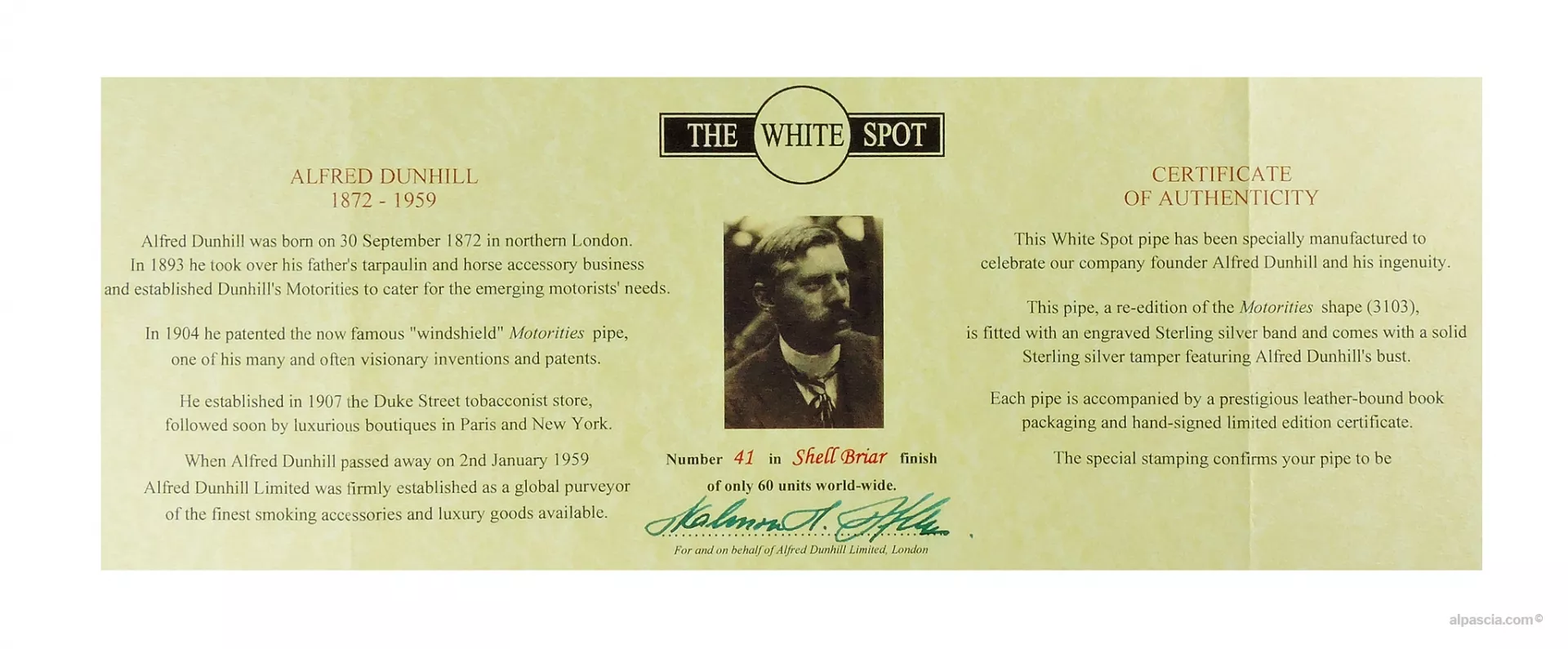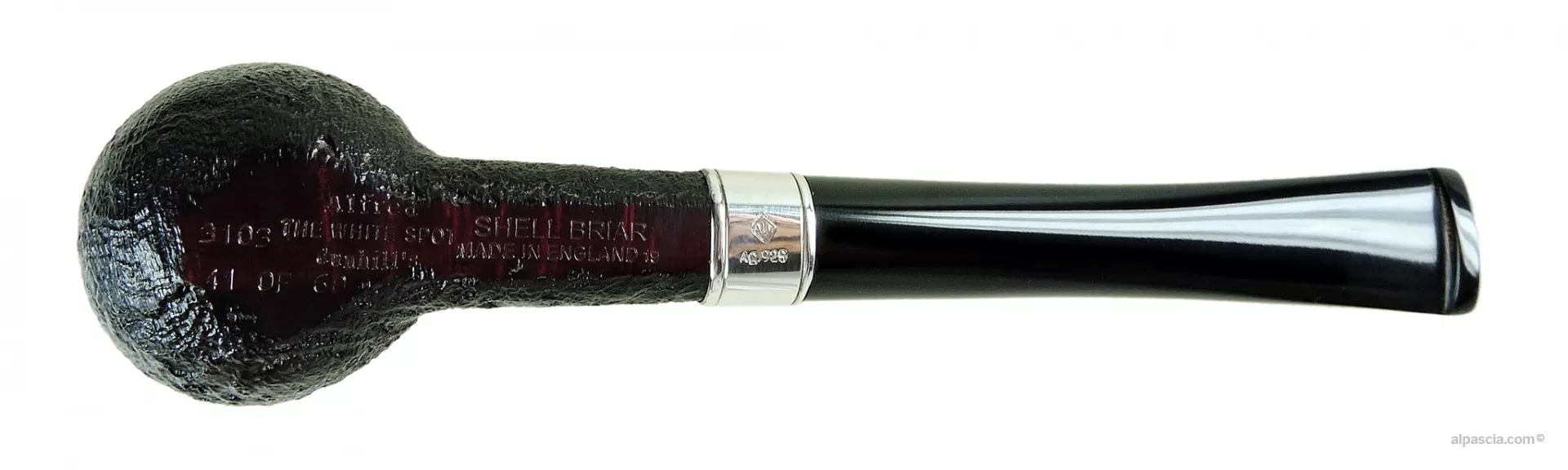Le pipe Alfred Dunhill sono la riedizione della famosa pipa “windshield” Motorities che è stata brevettata nel 1904. Queste versioni di forma Billiard (3103) sono decorate con una ghiera in argento massiccio incisa con il marchio del produttore AD posto tra la data di nascita "1872" e la data di morte "1959" di Alfred Dunhill.