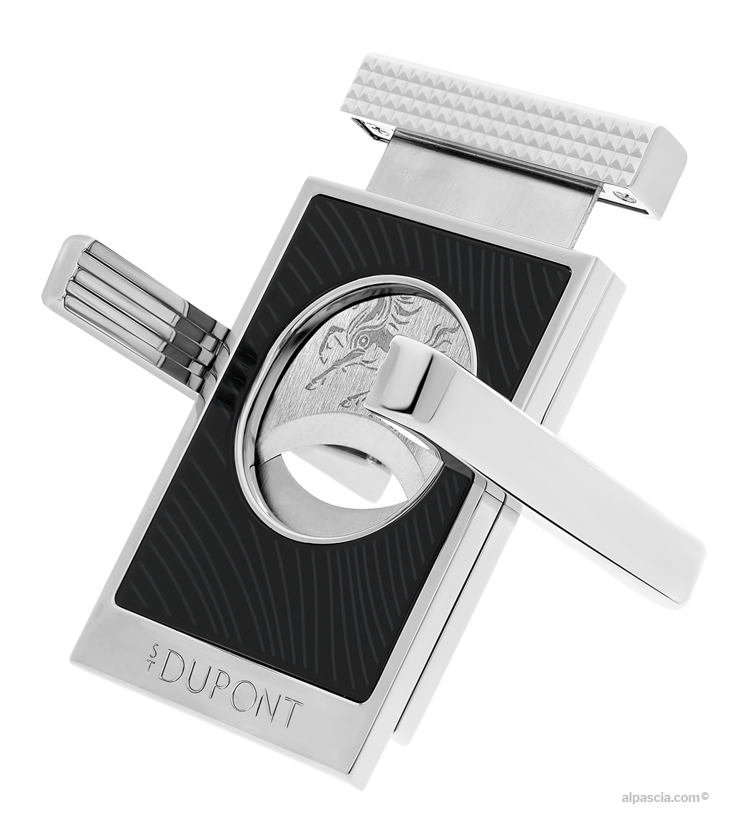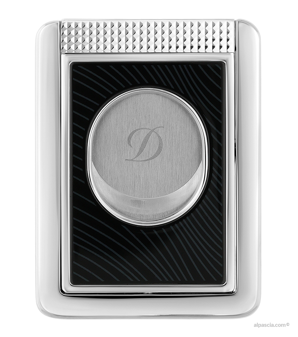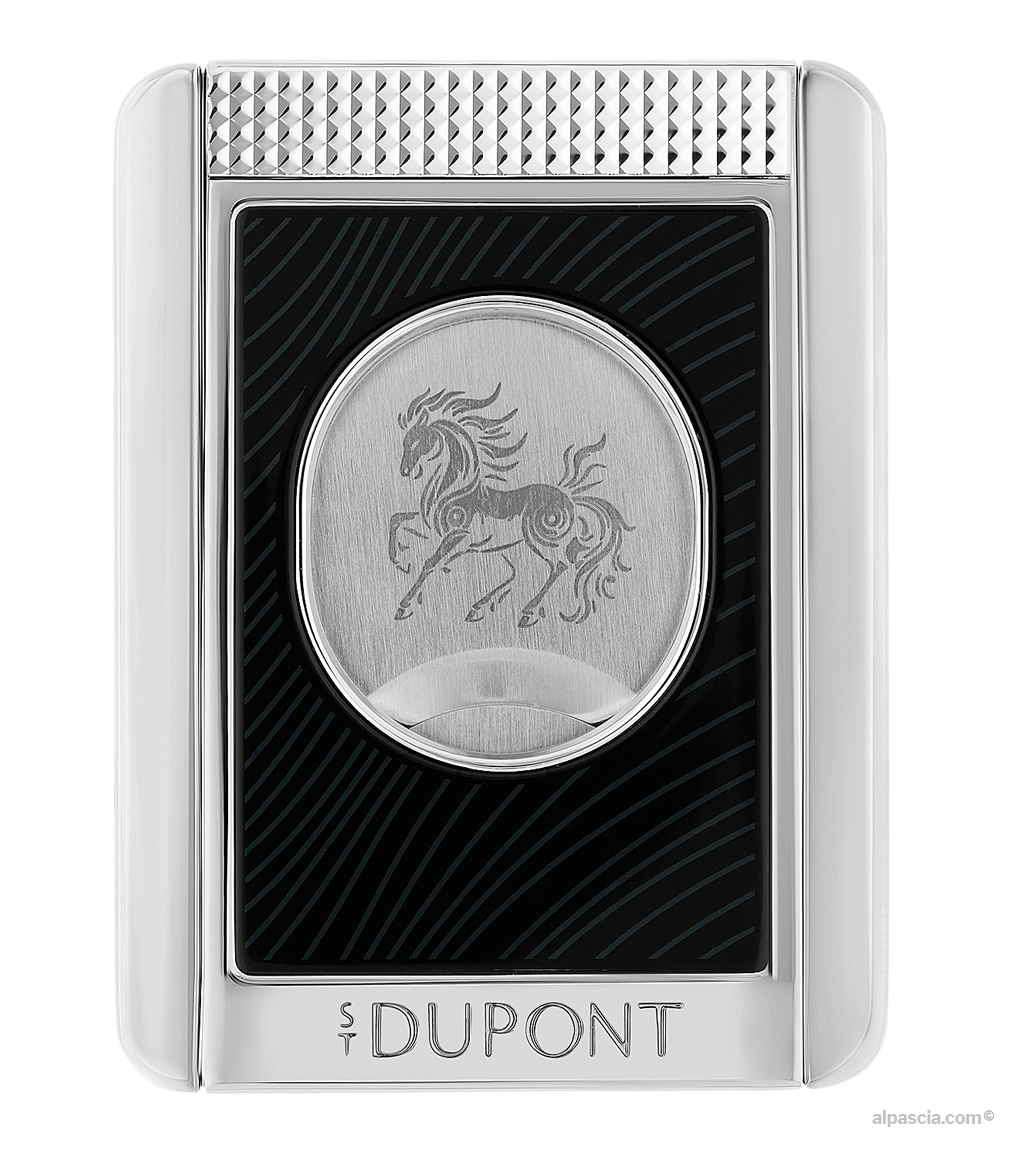 Supporto per sigari in lacca nera lucida, decorato con il motivo a “criniera di cavallo”. Lama incisa con il motivo del Cavallo di Fuoco. Finitura cromata.